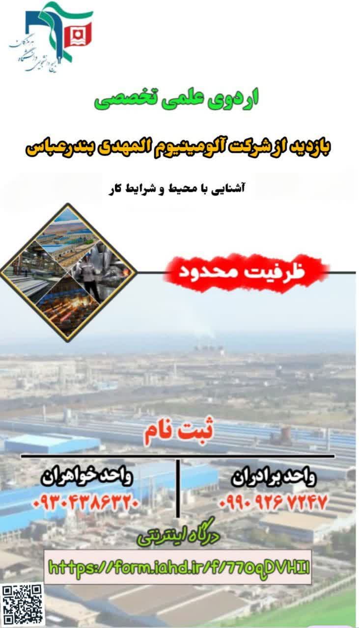 در راستای تقویت ارتباط میان دانشگاه و صنعت و با هدف افزایش مهارت‌های کاربردی دانشجویان، بسیج دانشجویی دانشگاه هرمزگان در نظر دارد بازدید علمی–تخصصی از شرکت آلومینیوم المهدی را برگزار نماید.