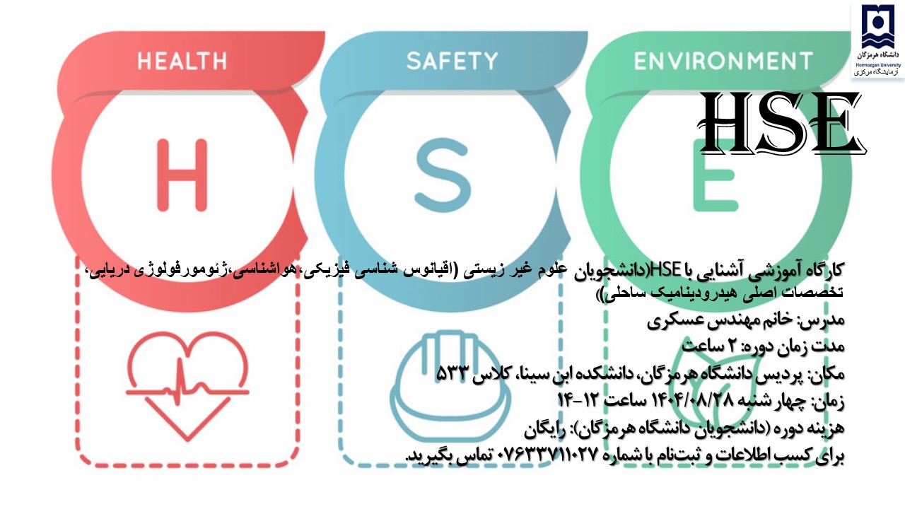 دوره آموزشی آشنایی با HSE(ویژه دانشجویان گروه علوم غیر زیستی (اقیانوس شناسی فیزیکی،هواشناسی،ژئومورفولوژی دریایی، تخصصات اصلی هیدرودینامیک ساحلی))