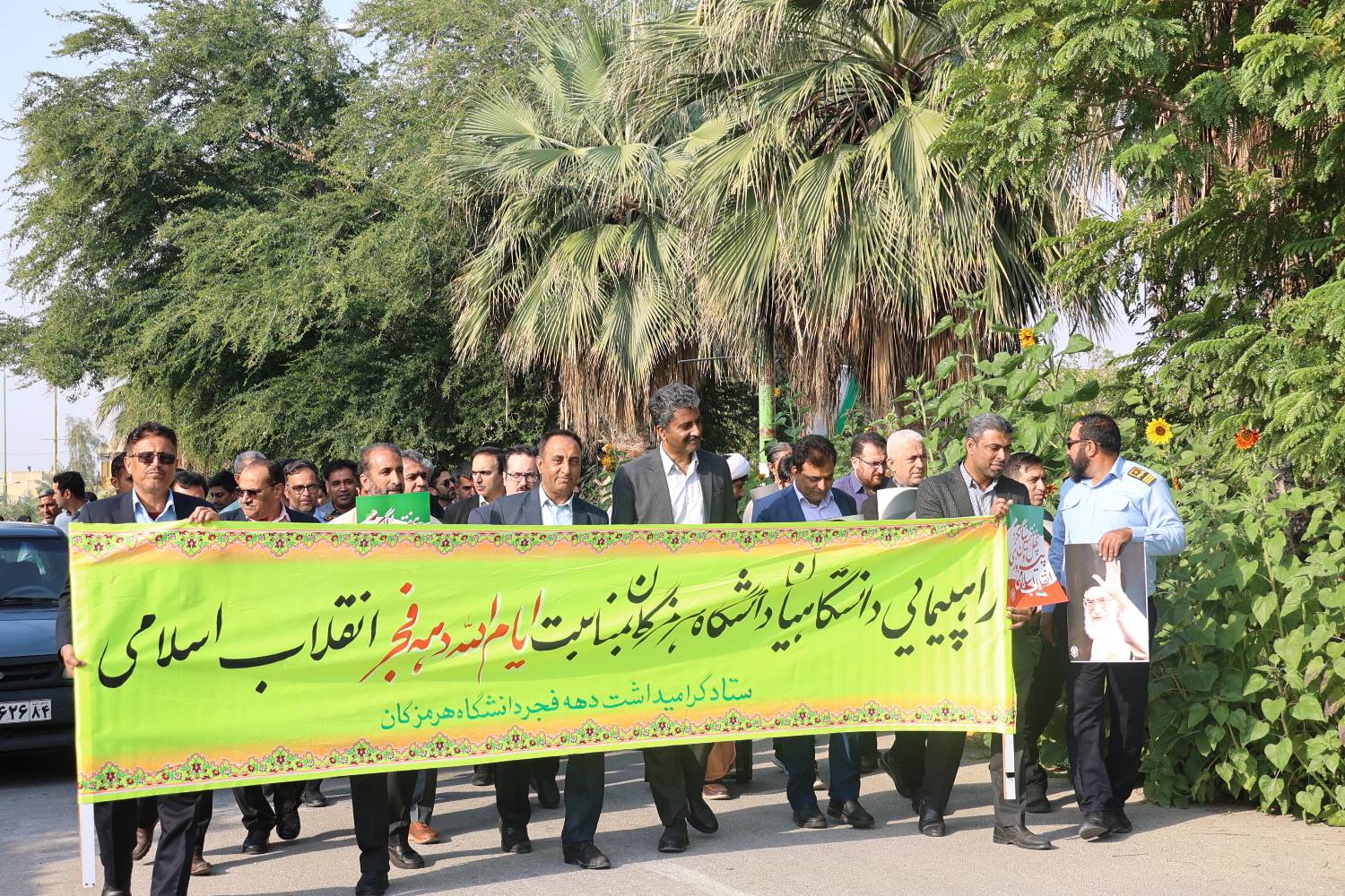 راهپیمایی به مناسبت فرارسیدن دهه مبارک فجر و سالروز پیروزی شکوهمند انقلاب اسلامی ایران، با حضور اعضای هیئترئیسه، اساتید وکارکنان دانشگاه برگزار شد. این مراسم با هدف گرامیداشت ایامالله دهه فجر، تجدید میثاق با آرمانهای والای انقلاب اسلامی و پاسداشت یاد و خاطره امام خمینی (ره) و شهداء برگزار گردید. شرکتکنندگان با حضور پرشور خود، ضمن سر دادن شعارهای انقلابی، بر پایبندی به ارزشهای انقلاب اسلامی و ادامه راه شهدا تأکید کردند.