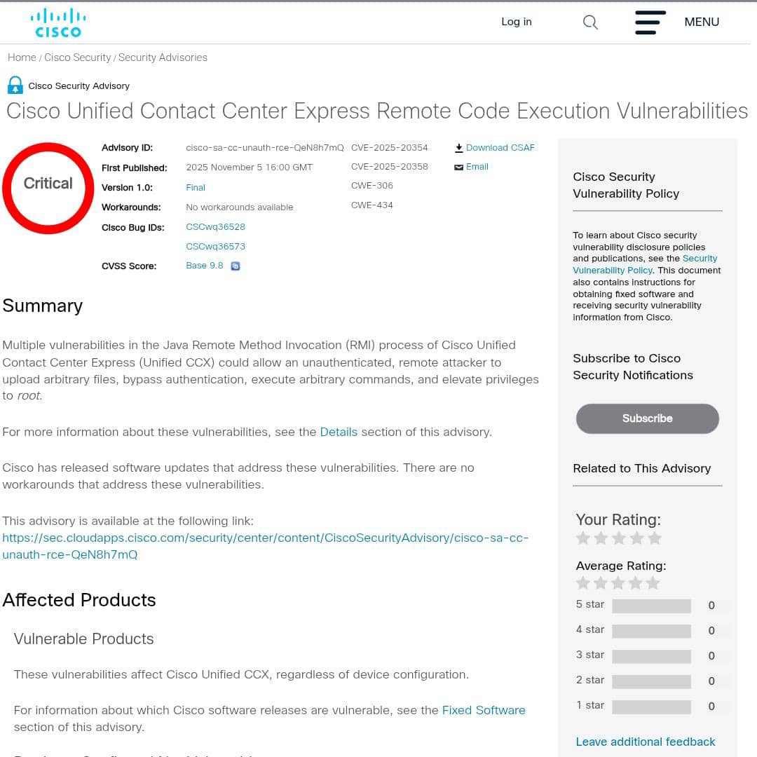آسیب‌پذیری بحرانی در Cisco Unified CCX — اجرا کد از راه دور (RCE) 🕓 انتشار رسمی: 2025‑11‑05 16:00 GMT.